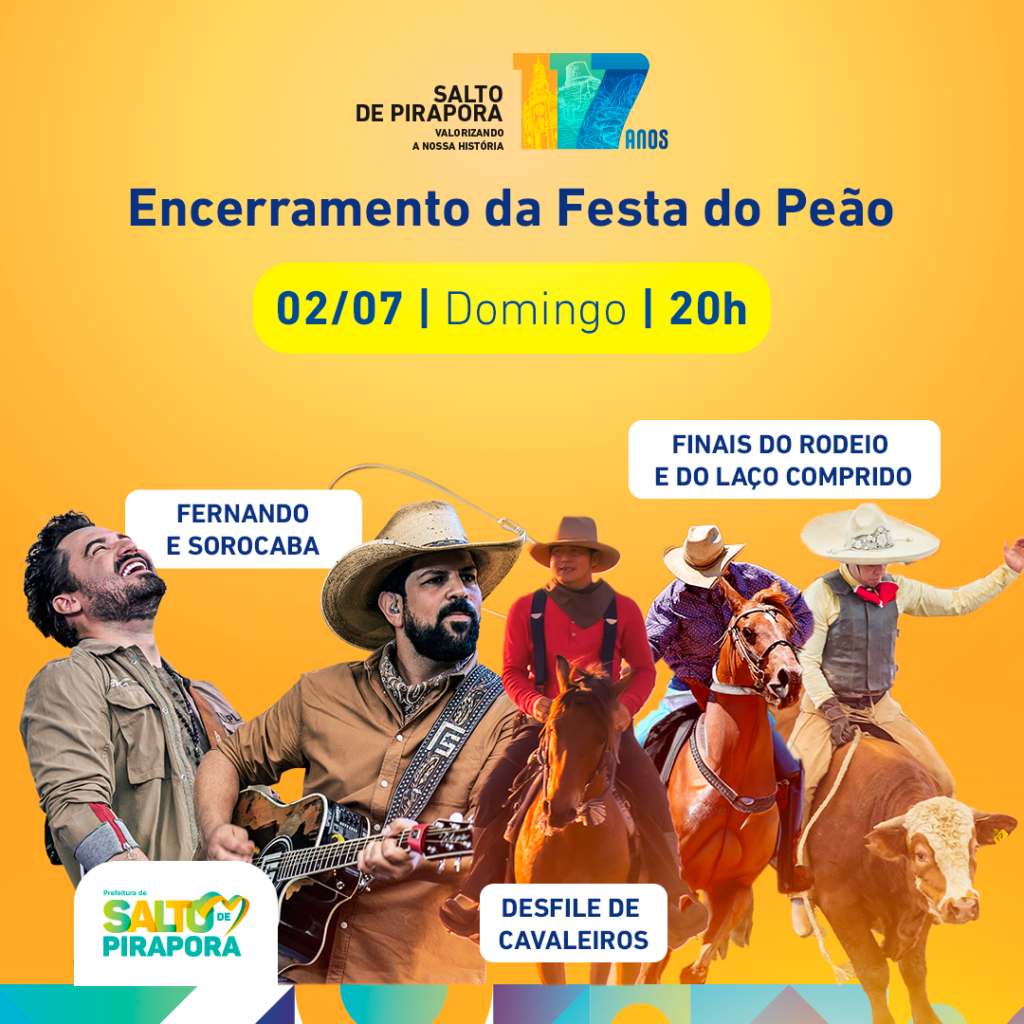Não percam o Desfile de Cavaleiros, o show espetacular de Fernando e Sorocaba, a final do Rodeio da PBR Brazil e a emocionante Prova do Laço Comprido! É momento de celebrarmos juntos o sucesso dessa festa inesquecível! Venha se despedir conosco em grande estilo! #37FestaDoPeão #SaltoDePirapora #FernandoESorocaba #PBR #LaçoCumprido #DesfileDeCavalheiros #PrefeituradeSaltodePirapora