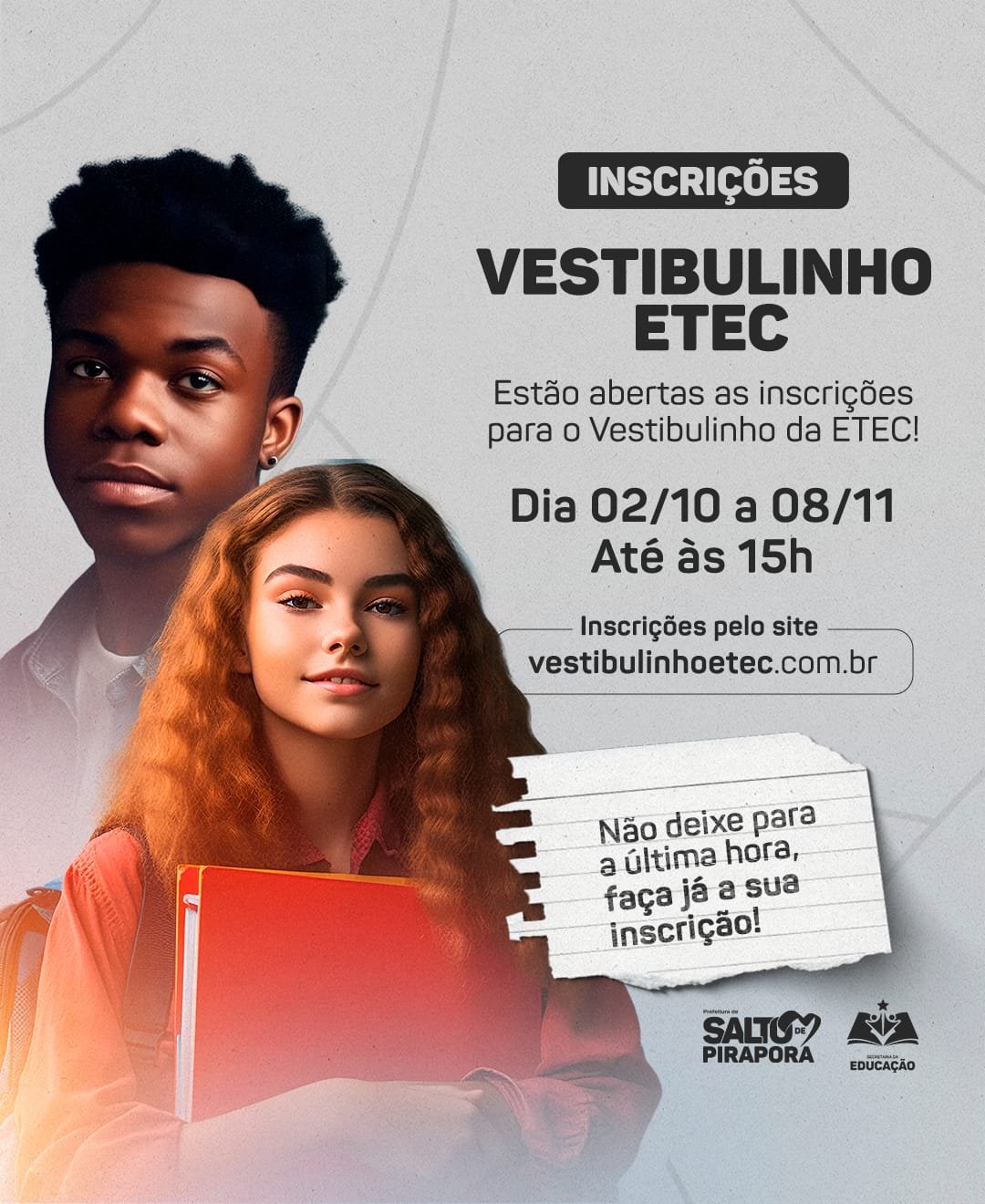 📢 Estão abertas as inscrições para o Vestibulinho da ETEC! 🗓 Período: 02/10 a 08/11 🕒 Até às 15hs 🌐 Inscrições pelo site: vestibulinhoetec.com.br Não …